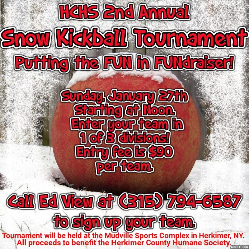 HCHS 2nd Annual Snow Kickball Tournament Sunday, January 27th, 2019, starting at 12:00pm at the Mudville Sports Complex. Ending time unknown. DIVISIONS: Grades 4-6 Grades 7-12 Adult Team entry fee is $90. Proceeds to benefit the animals at Herkimer County Humane Society. Call Ed View at (315) 794-6587 to sign your team up for the … |
