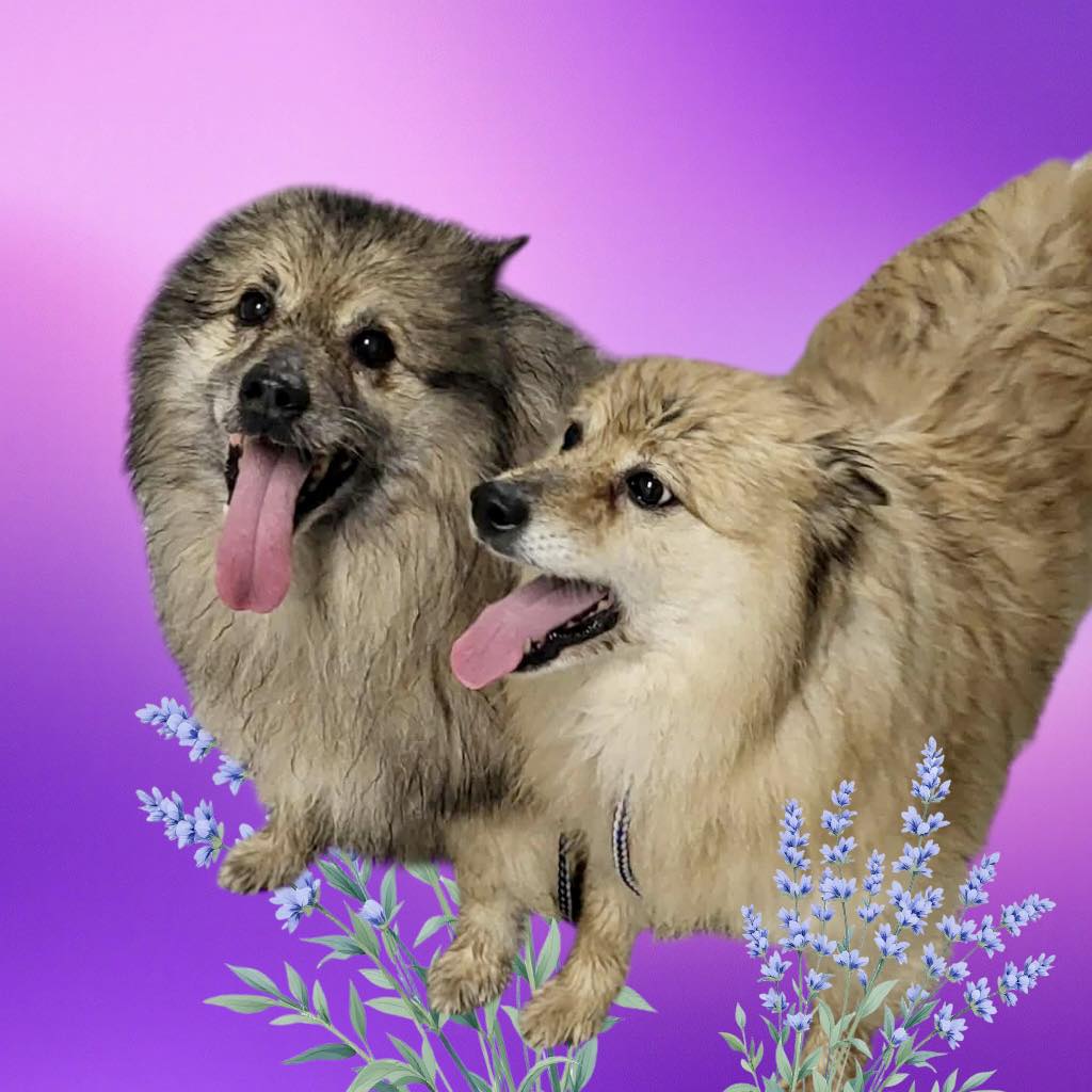 Clyde and Cindy are a bonded pair of American Eskimo mixes between 8 and 10 years old, weighing around 38lbs. Good with cats.