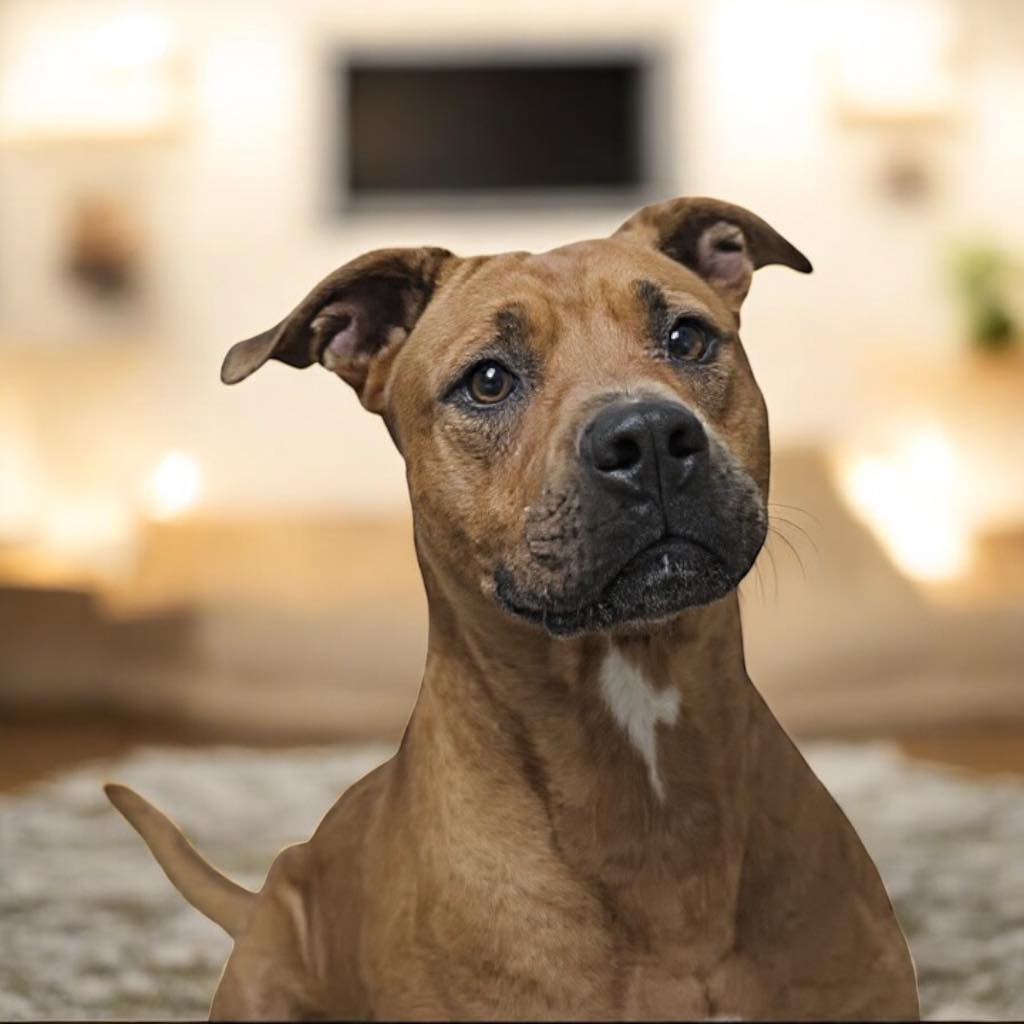 Doug is about 2 years old. He knows sit, shake, stay and lay down…is good with cats and loves the lady dogs. 58 lbs