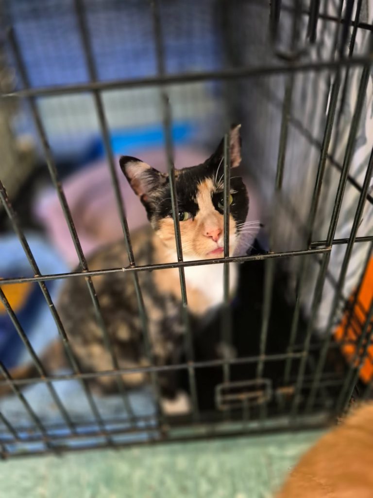 She is between 1-2 years old. She is very loving once she knows you, she’s currently residing in our office but seems to love being around kittens, which makes sense seeing as she came in with 3 of her own, they have been adopted.